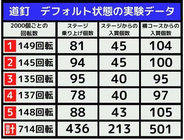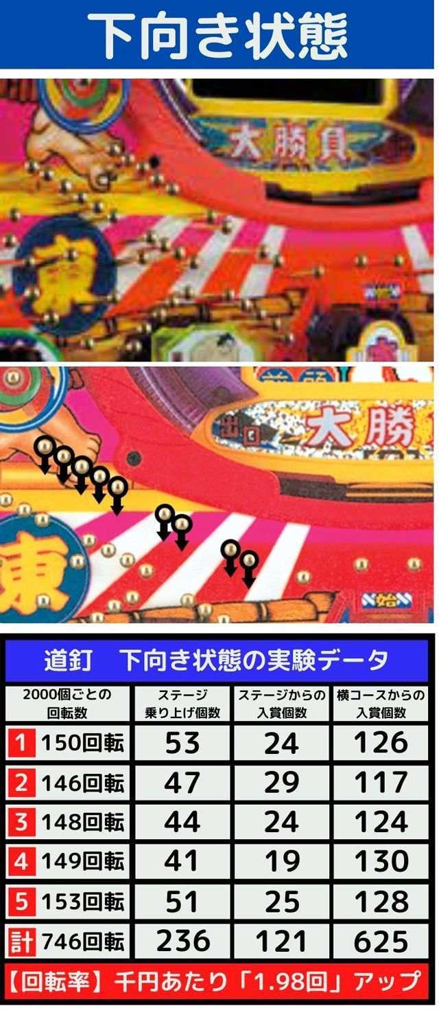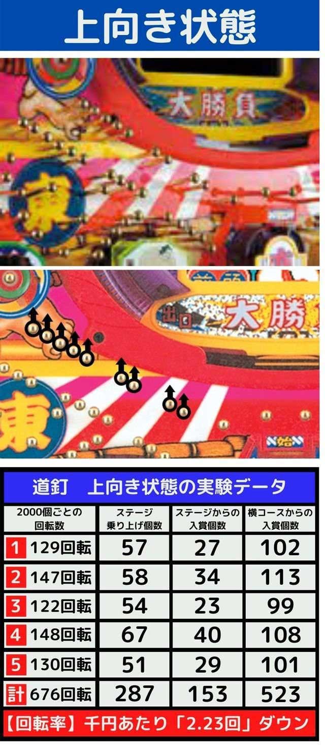 多くの雑誌で今まで一番良いとされていた「道釘の上向き状態」ですが、結果は3パターン中で最低。上向き状態が良いとされていた大きな理由でもある「ステージへの自力乗り上げ率」もアップしませんでした。
