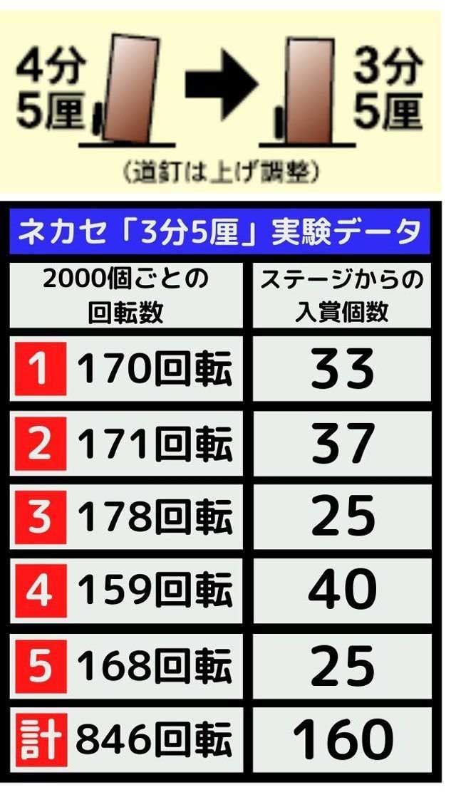 検証で意外なほどに「自力乗り上げ」による入賞が多かったため、今度は実際にお店でよく使われているという「3分5厘」のネカセで検証してみました。が、結果はご覧の通り変わらず。
