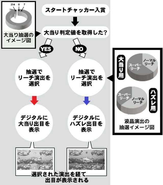 多くの方がアツい視線で見守る「リーチ」などは単なる「演出」であり、大当りか否かには全く無関係。デジタル画面の役割は、単に抽選結果を表示するだけなのです。
