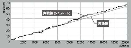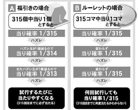 福引きの場合、確率の逆数分だけ試行すれば必ず大当りが出現しますが、ルーレットの場合そうはいきません。1回の試行でいきなり当たったり、315回試行しても当たらないといった現象が起きてしまいます。