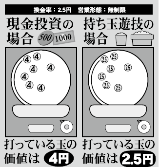 現金投資時は4円の玉を、持ち玉遊技時には2.5円の玉を投資していると考えればわかりやすいでしょう。