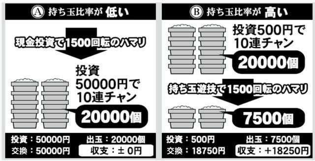 【図1】条件が同じでも…持ち玉比率が違うだけでこれだけ差がつく(2.5円交換無制限の場合)