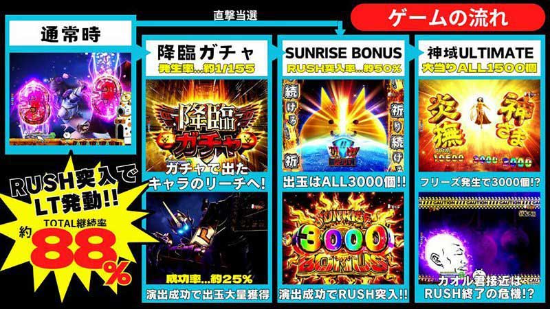 ④そのBONUS中の演出に成功すれば(成功率50%)LT「神域ULTIMATE」へ突入(失敗したら①に戻る)