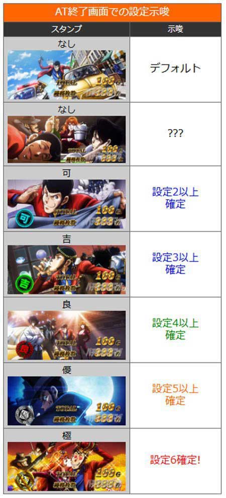 スタンプは全5種類存在し、可=設定2以上確定、吉=設定3以上確定、良=設定4以上確定、優=設定5以上確定、極=設定6確定となる。
