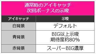 青背景が出ただけでも、次回BIG以上の期待度は約80%。赤背景のアイキャッチが出現した場合は、次回スーパーBIG濃厚だ。