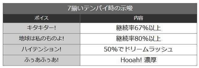 BC開始の7揃い時にテンパイボイスが発生する事があり、ボイスによって継続率などの示唆を行っている。