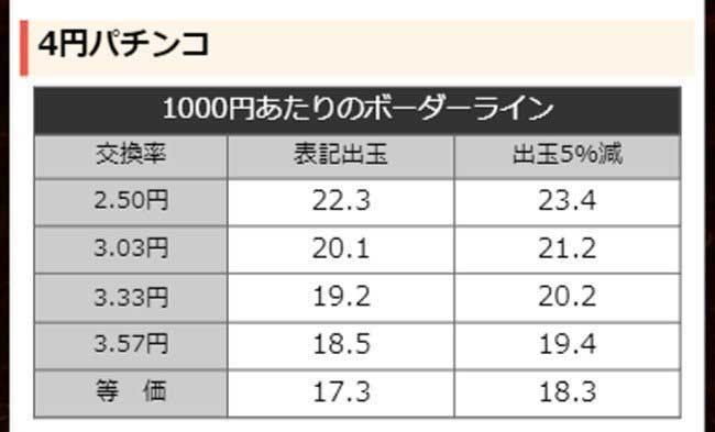 千円あたりのボーダーライン(※理論上、収支を±0円にするために必要な回転数)がコチラ。