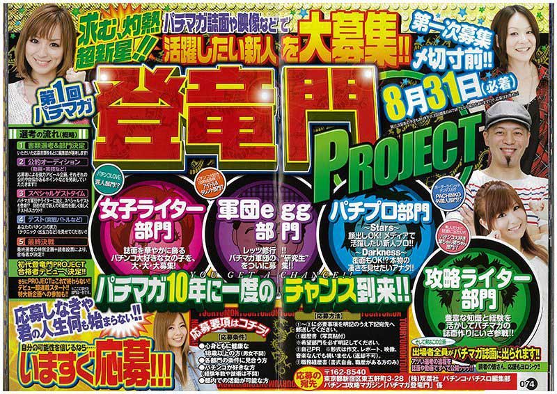 「登竜門」とは…新たなライター・演者を発掘すべく開催される超大型オーディション企画。合格した人はもれなく全員がパチマガスロマガが展開する各メディアで活躍するチャンスをゲットできるのだ。