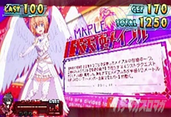 さて今回は6台並びで5・6狙いなのだが、早い段階で隣の台からキャラ紹介・大天使メイプルが出てしまった。これは0.05~0.50%というなんとも絶妙な設定差である。