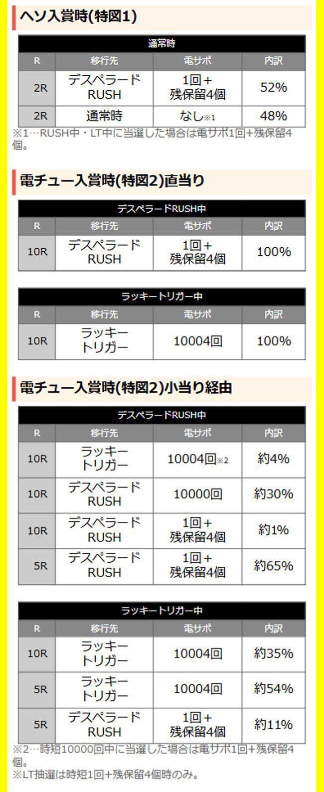 演出的には、デスペラードRUSH中のブラックアウト後、銃弾饗宴(バトルタイプ選択時)orばりゃりゃいか(カウントダウンタイプ選択時)発生でラッキートリガー突入となります。