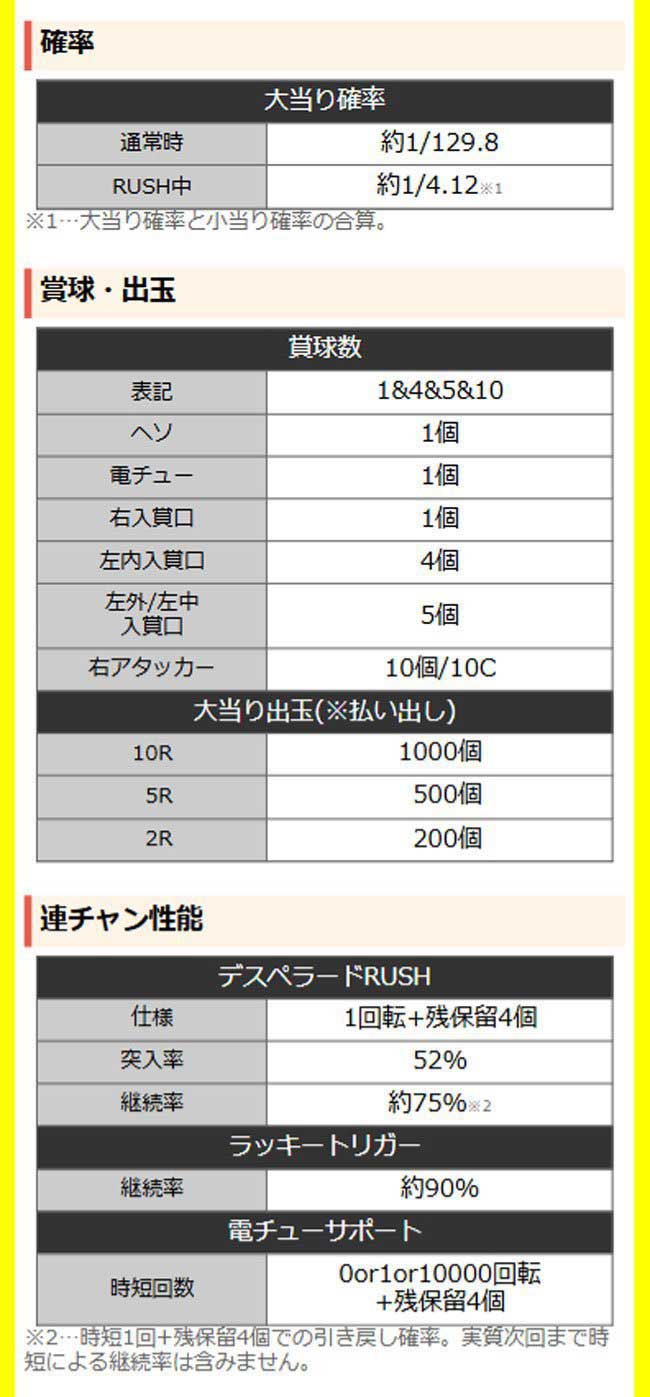 通常時の大当り確率は約1/129.8で、チャージ演出は非搭載。全て図柄揃い大当りとなり、図柄揃い後にRUSH突入を賭けたボーナスジャッジ演出が発生します。