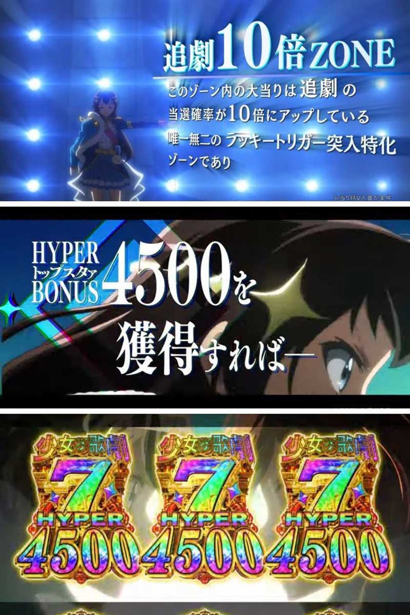 そして、RUSH中にはラッキートリガー(LT)の「追劇」があり、約20%で発動する。「追劇」中は1500個の上乗せが約52.5%でループ。「HYPERトップスタァBONUS4500」を引くと、突入時点で4500個が保証され、「4500個+追劇」となる。突入時は8.6%で「一劇10500個OVER」、7.1%で9000個、13.1%で7500個、23.7%で6000個、期待出玉は16000個OVERにもなる(※突入前の平均出玉+最低保証出玉+突入後の平均出玉の合算値)。