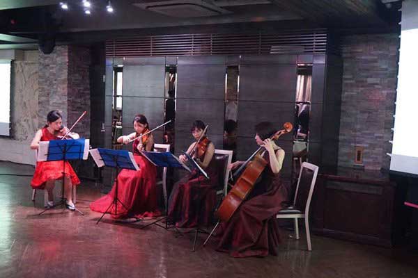 ヴァイオリンおふたりにヴィオラ、チェロの弦楽四重奏によるエレガントな生演奏で来場者をお出迎えです。