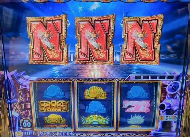 写真は922G天井で当選した際のものだが、N揃いは「金勝撫缶を所持した状態でのAT当選」を示唆している。すなわち、222G付近から前兆が始まってN揃いが出てきたら、天井の恩恵である「AT+金勝撫缶」を獲得したと判断できるというわけだ。