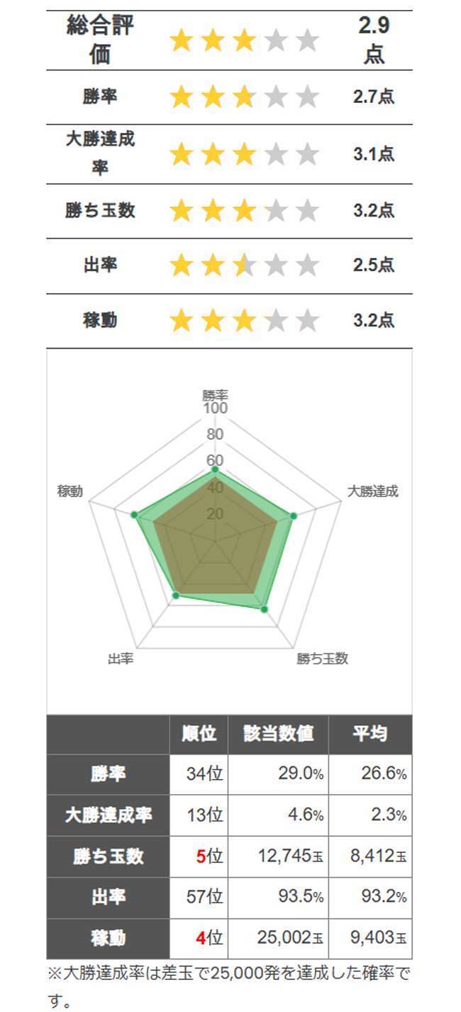 勝ち玉数5位は健闘したと言えるものの、他は特に可もなく不可もなくという状況のようです。客付きも閉店間際でガクッと下がるものの、開店から平均50%を維持…もっとも、現在客付きがいいのは『番長』一強と言えるので、他の機種がどれだけ生き残れるかのサバイバルゲームでしょう。本機はシン・エヴァの至高のST演出がLTに入れば約91%で楽しめることもあり、台数的にもバージョン機らしくほどほどなので、生き残る率は高めなんじゃないでしょうか!?