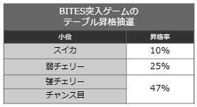 また、BITES突入ゲームでのレア小役はこの報酬テーブルの昇格抽選が行われている。