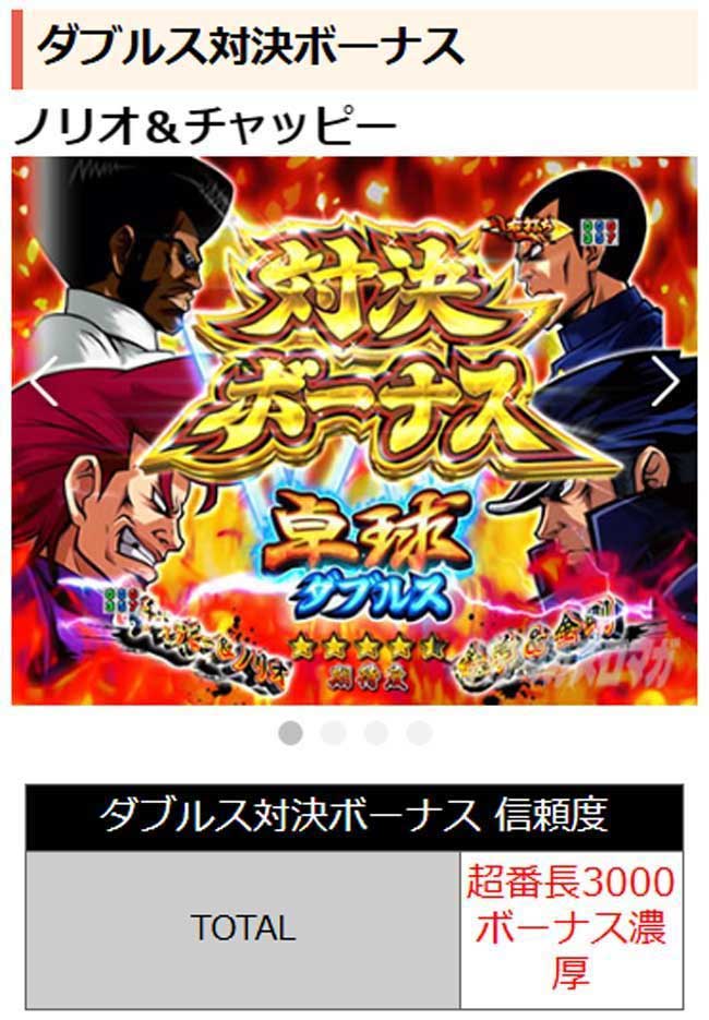 対決ボーナスのタイトル画面でロゴが最下部まで落下すると、ダブルス対決ボーナスに発展! 対決キャラを問わず、超番長3000ボーナス濃厚!!