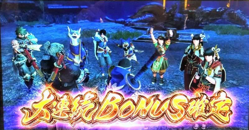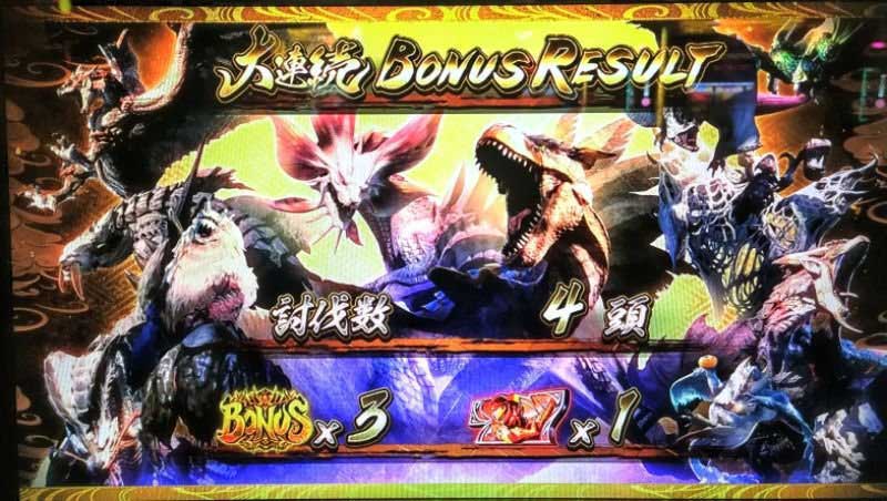 討伐できたのは4頭。まあこんなものかもしれないが、初当り+ ストック3個のスタートはデカすぎる。 というか大連続ボーナスの消化が面白すぎ。