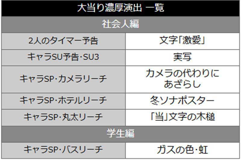 上記、恋愛モード中の大当り濃厚演出はすべて確変直撃(突然確変含む)。出た瞬間に連チャン確定となるので、安心してその後の展開を見守ろう。
