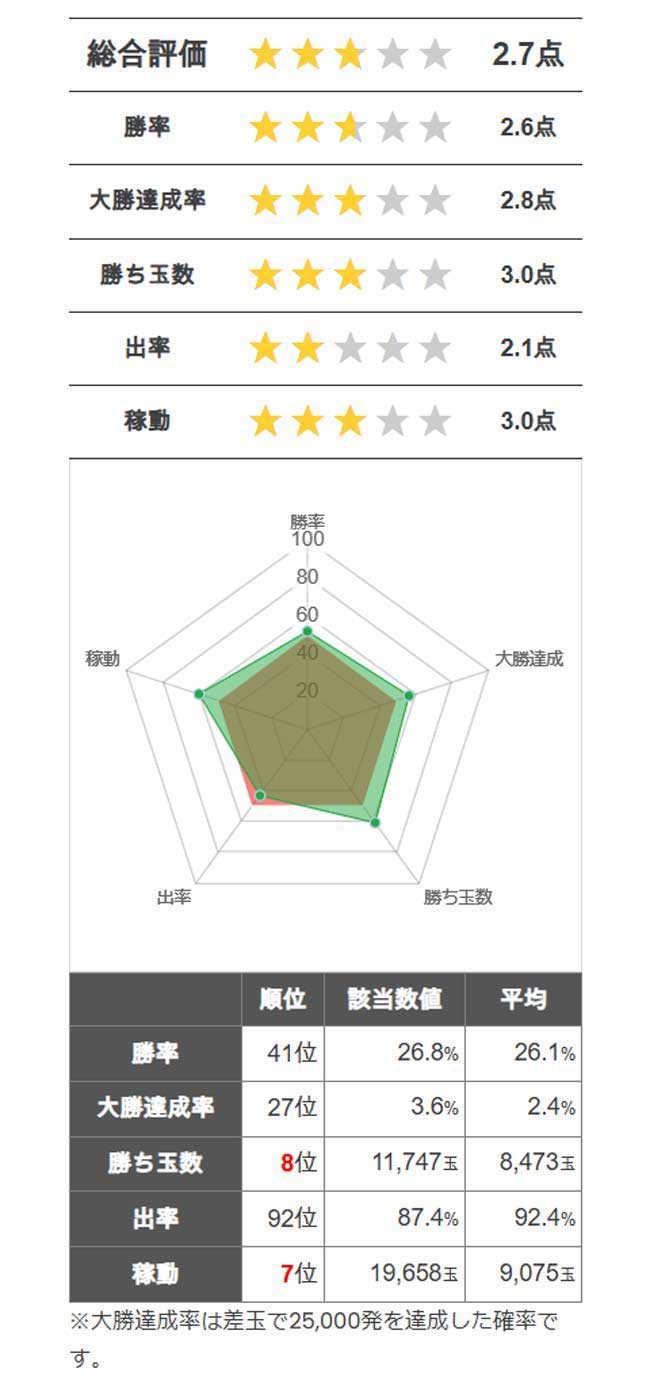 数多あるパチンコ新台(※1~2月の新台合計28機種)も含めた現役機種の中で、稼働7位&勝ち玉数8位はバージョン機としては立派な成績ではないでしょうか。大勝達成率も27位とライトタイプにしては高めな順位も見逃せないところです。