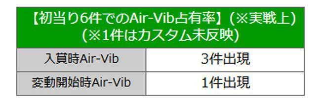 実際に大当り変動の入賞時にAir-Vibが発生した割合は約50%でした。入賞時にAir-Vibが出現すれば安心ですが、無くても展開次第では大当りに期待出来ます。