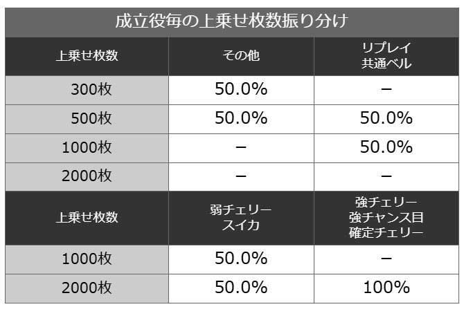 共通ベルやリプレイ成立なら半数が1000枚上乗せとなり、レア小役成立なら1000枚以上の上乗せが確定。
