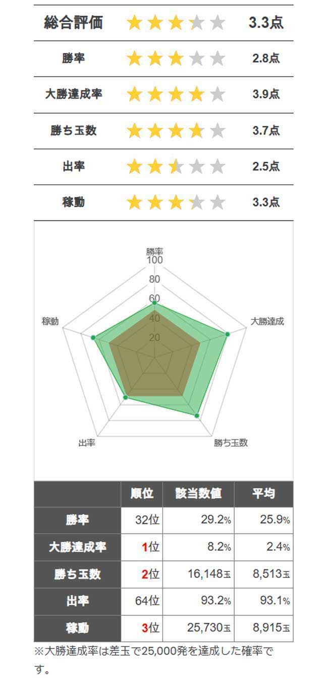 3/3のパチンコ新台導入は本機を含めて8機種。その中で大勝達成率1位、そして勝ち玉数2位&稼働3位というのは好発進と言ってもいいでしょうが、人気的に割れた感じなのか、平均稼働3万個未満は少々寂しい感じ。勝ち玉数は相変わらず人気の『番長』に次ぎ、稼働は『番長』と新台『俺妹』に次ぐ…というのが3日間のデータになりますね。