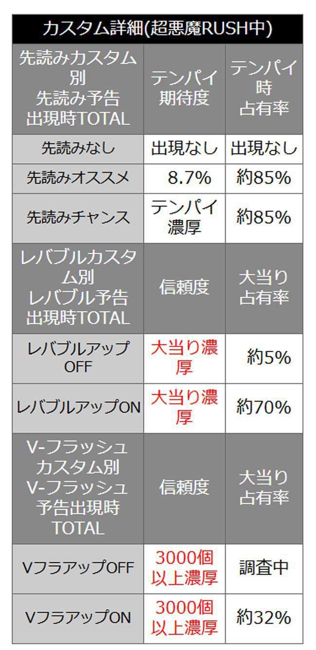 RUSH中のレバブル発生ポイントは上記の「運命の一劇」中(保留チャージ中)以外に、ジャッジメント告知・煽り中、ボタン一撃告知・ボタン完成時、5回攻撃告知・殴る直前に先レバブル、悪魔の扉告知・長押し成功時で、発生すればいずれも大当り濃厚。