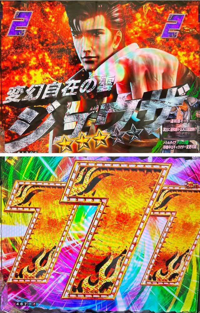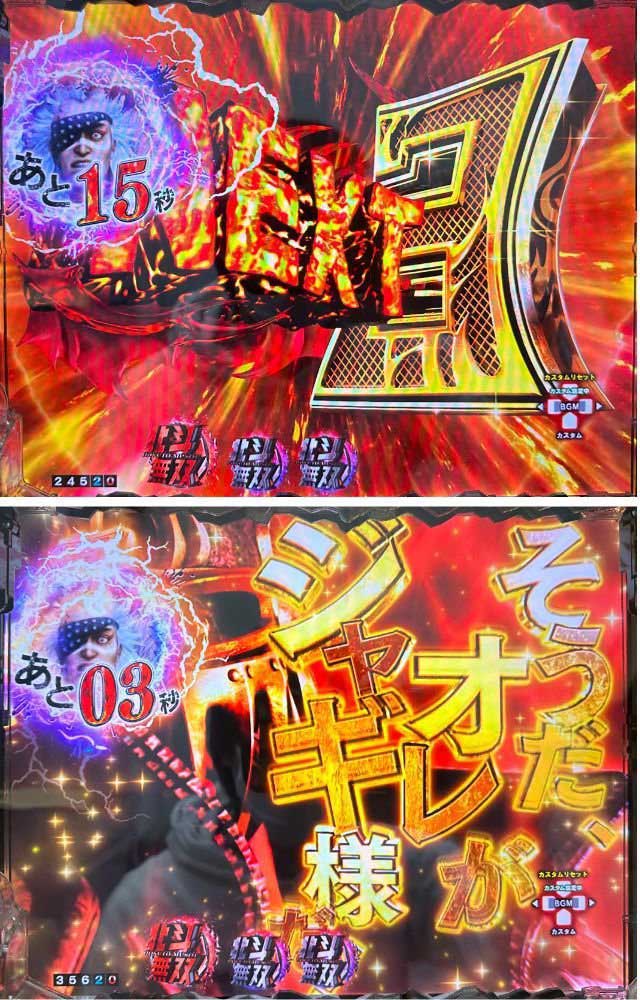 当該変動で赤保留に変化して、連続予告×3(金文字)に画面いっぱいにジャギの金セリフ!