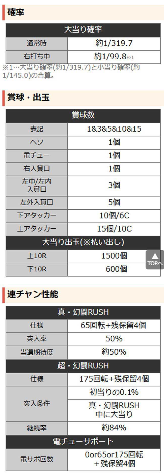 通常時は約1/319.7で図柄が揃い、チャージ演出はナシ。初当りの50%で真・幻闘RUSHに突入!
