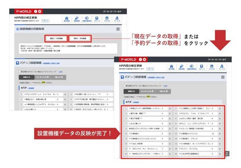 今回の連携によって、『Xシステム』に登録された設置機種データを、簡単なボタン操作だけでP-WORLDの自店舗ページに反映できるようになる。従来の手動入力による機種名や台数の登録作業が不要となり、ホームページの修正・更新の負担を大幅に軽減することが可能となる。