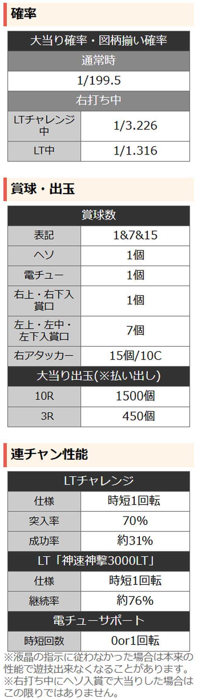 LT「神速神撃3000LT」はLTチャレンジ同様に時短1回転だが、確率は1/1.316にアップ。継続率約76%で、手に汗握る極限の1回転勝負を楽しめるぞ!!