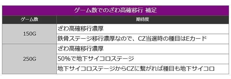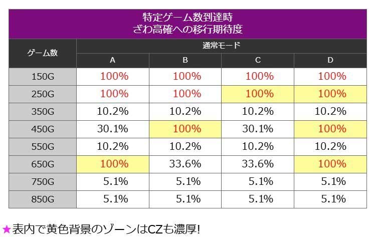 また、特定ゲーム数到達時は通常モードを参照してざわ高確への移行抽選が行われる。