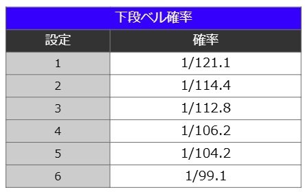 具体的な数値を見ると、設定1の121.1分の1から設定6の99.1分の1まで、段階的な設定差が設けられている。