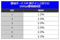 このボーナス中は押し順ベルやチャンス目でポイントを蓄積していくが、実は単チャンス目から3000ポイントを獲得する割合に設定差が設けられている。