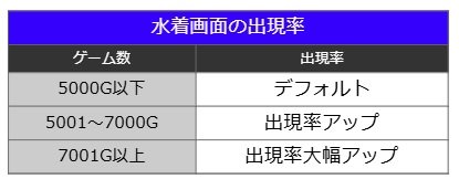 特に設定6が確定する水着画面については、当日の総消化ゲーム数によって出現率が変動するという特徴があり、後半ほど出現しやすい。