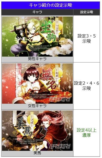 基本的には奇数設定なら男性、偶数設定なら女性が出現しやすくなっているが、設定1に限っては男性と女性の出現割合が均等という特徴がある。