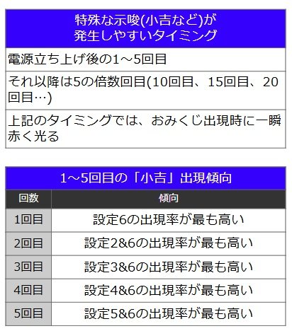 また下記にあるよう特定のタイミングでは設定によって「小吉」が発生しやすくなっているため、おみくじの回数には常に注目しておこう。