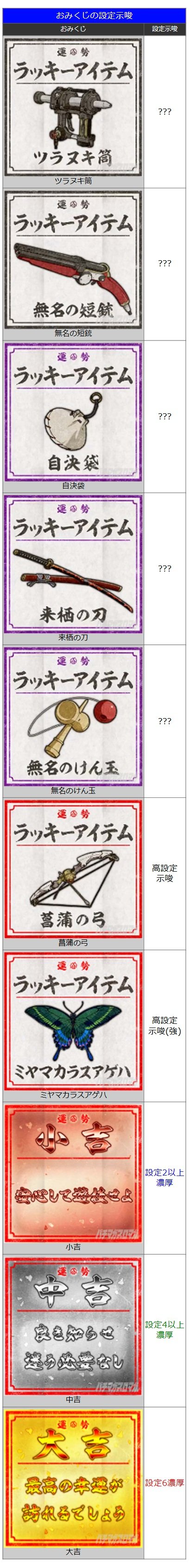 通常時にサブ液晶でおみくじが出現した際、アイテムくじを選択すると設定を示唆する特定のアイテムが表示されることがある。