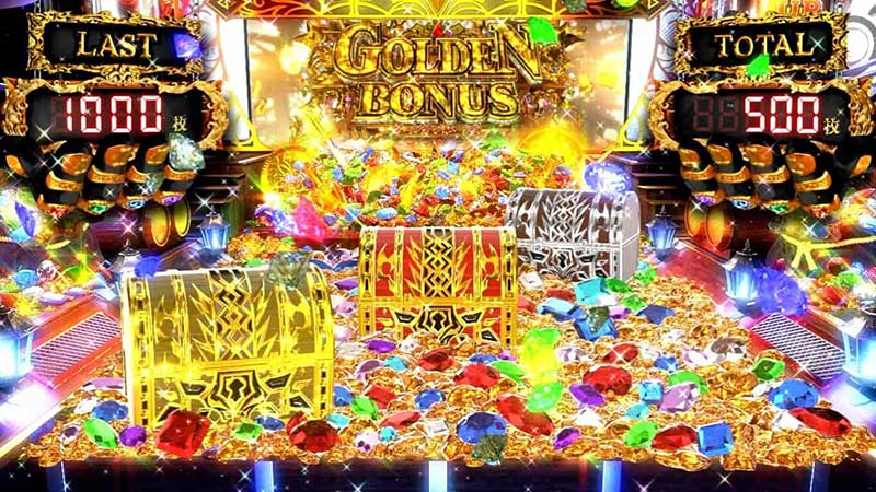 AT「ゴールデンボーナス」はナビに従うだけのカンタン消化。純増は約8.2枚と超高速で、みるみるうちにコインが増加します。