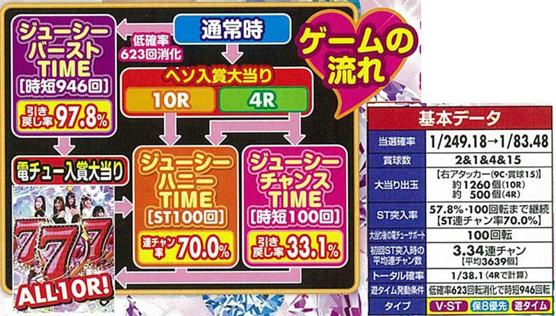 スペック違いの紹介は今回はおいといて…メインとなる「Pジューシーハニー3」はライトスペックのST機。ST連チャン率は「2」よりもアップして、70%となっています。