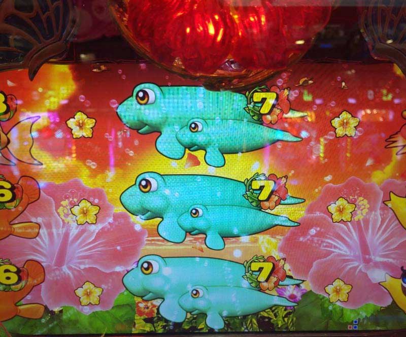 少しずつ回転率が落ちてきた356回転目、ノーマルリーチの変動中にハイビスカスがチカチカとサプライズ告知。ミドルスペックでもノーマルリーチで当たる海シリーズの演出バランスは、相変わらず秀逸だよね。