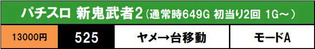 サッとホールを回ってみると、1台空いていた『パチスロ 新鬼武者2』。これが狙い台ということもあり、打つ価値があると判断しました。すでに天井に到達している台もあることから全台系の可能性はほぼ否定なので、ここも単品狙いという形になります。