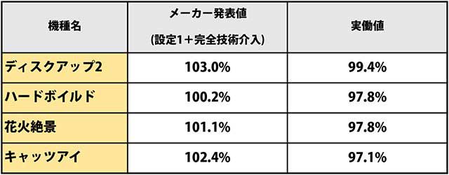 …というように機械割に4%程度差が現れた機種は、原因がメーカーの数値の誤りか技術介入の難易度が高すぎるのか分かりませんが、実際に打たれた数値をみてみると全く甘くないことがわかります。