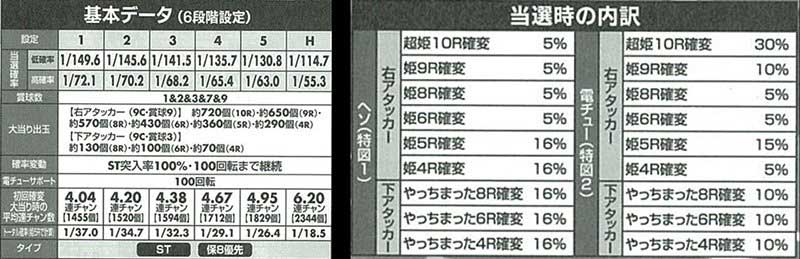 本機のスペック最大の特徴といえば6段階の設定。最高設定のHなら当選確率は1/114.7とかなり甘めに遊ぶことができる仕様となっています。また、ゲーム性は突入率100%のSTタイプ(100回転継続)で、右アタッカーで消化される超姫10R確変なら約740個の出玉も獲得可能。思わぬ一撃も期待できちゃうんです!