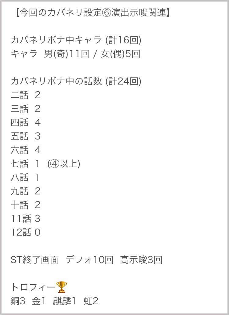 し『今回は設定4以上確定の「七話」が出てはくれたけれど、設定4以上打っていても出現せず終わる事のが多いし。「話数が多いほど高設定の期待度アップ」とは言われているけれど、今回みたいに少ない話数の方が出る頻度的に多いから、どこまで参考になるかは謎。十話以降、特に「12話」なんかはさすがにポイントにはなりそうだけどね』