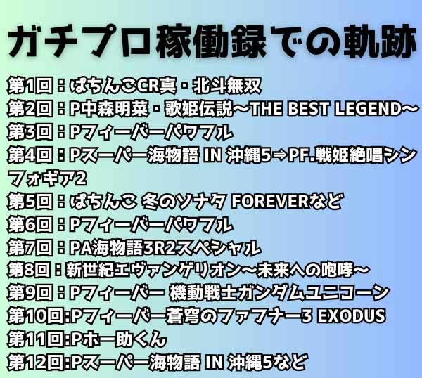 パチマガスロマガFREEにて毎週土曜日17時更新のプロによる稼働コラム、『ガチプロ稼働録』。週替わりで8人のメンバーが日々の稼働の中から、単日を切り取った内容を執筆してくれています。