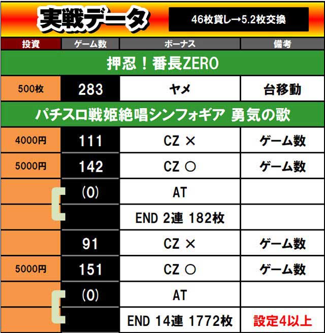 この日は朝イチ『押忍!番長ZERO』からスタートするも挙動イマイチで早々にヤメ。しばらくホールを徘徊していると、ポツポツとお客が付いていた『パチスロ戦姫絶唱シンフォギア 勇気の歌』で足が止まる。