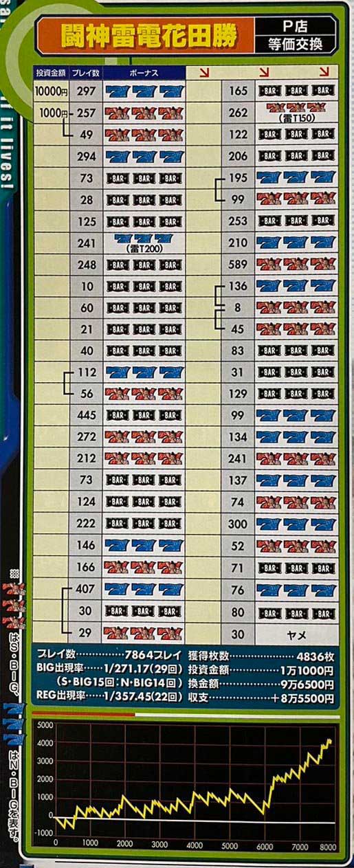 結果4836枚のコインを獲得。帰宅後データをまとめると、雷電タイム中のBIG確率が約337分の1という、低設定台を打っていたら間違いなく玉砕していたであろう展開でした。良しっ!