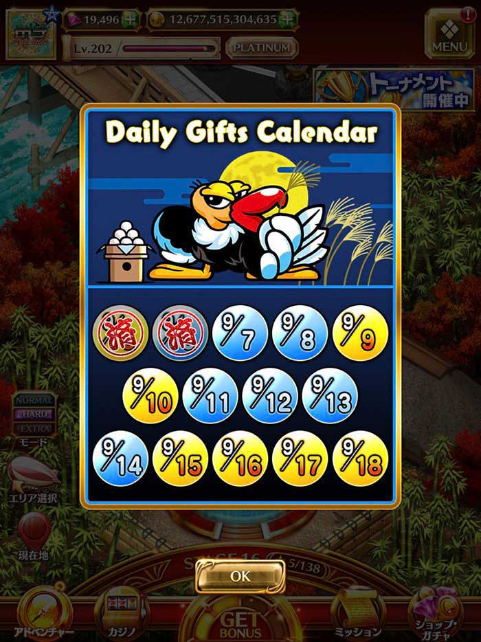 狙っていたコイン増やしですが、お気づきですか? 最新の持ちコインがデイリーギフトカレンダーのスクショに映りこんでいるのですが、なんと7兆だったコインが12兆まで増えました! やったー!!(ケタあってるよね…?)